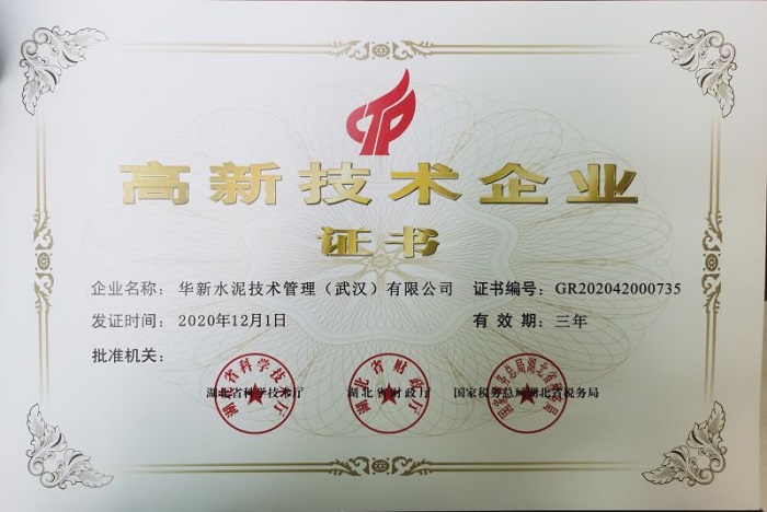 近日,華新水泥技術(shù)管理(武漢)有限公司獲得由湖北省科學(xué)技術(shù)廳、湖北省財(cái)政廳和國家稅務(wù)總局湖北省稅務(wù)局聯(lián)合頒發(fā)的高新技術(shù)企業(yè)證書。